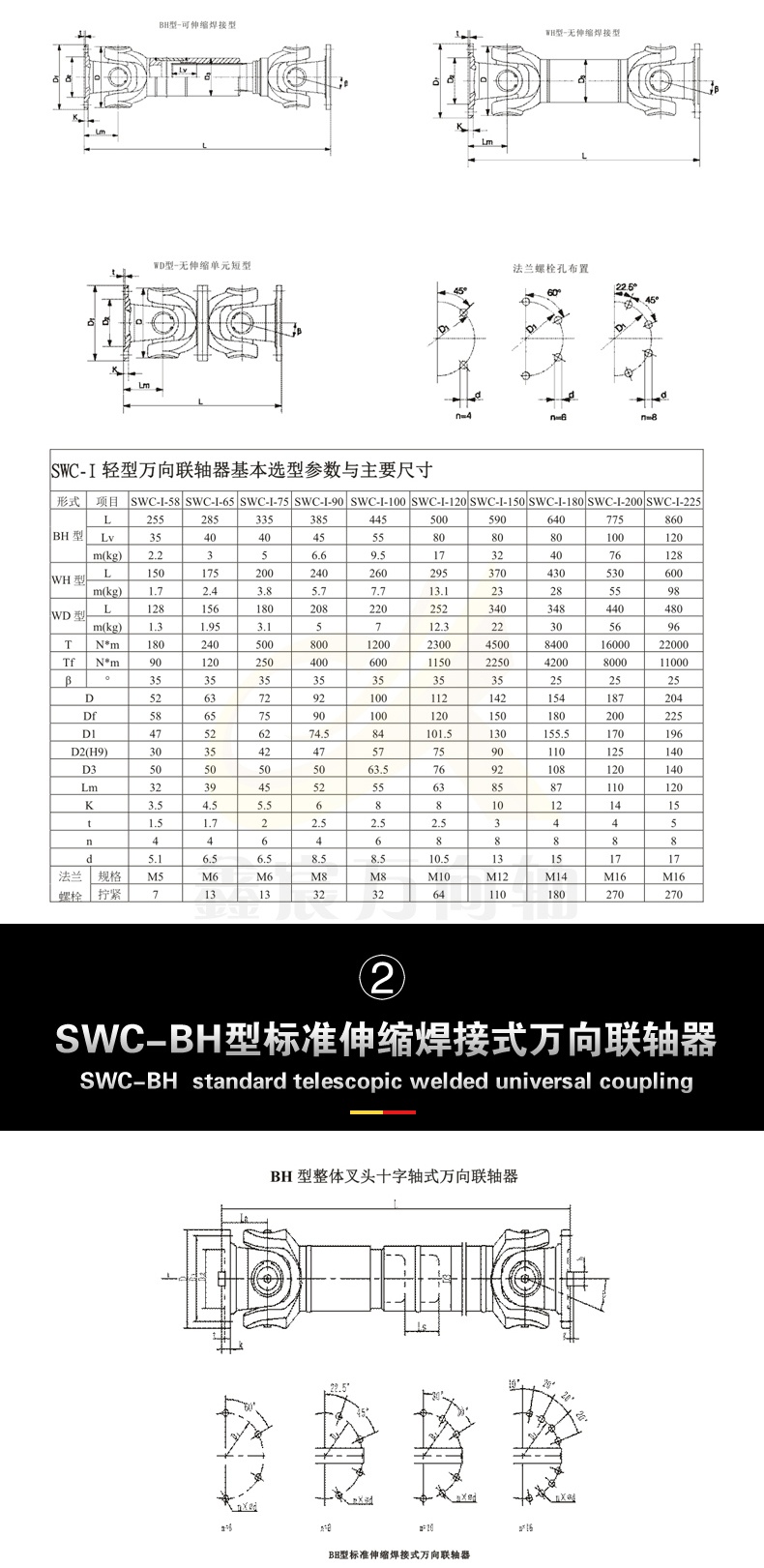 SWC-I型萬向聯軸器主要適用于造紙設備、普通機械、水泵設備和測試試驗臺等各類通用機械場合。聯接兩個不同軸線的傳動軸系。其法蘭直徑為65-225mm,傳遞額定轉矩范圍200-22,000N.m,軸線折角為25°。萬向聯軸器應根據載荷特性、計算轉矩、軸承壽命及工作轉速選用。